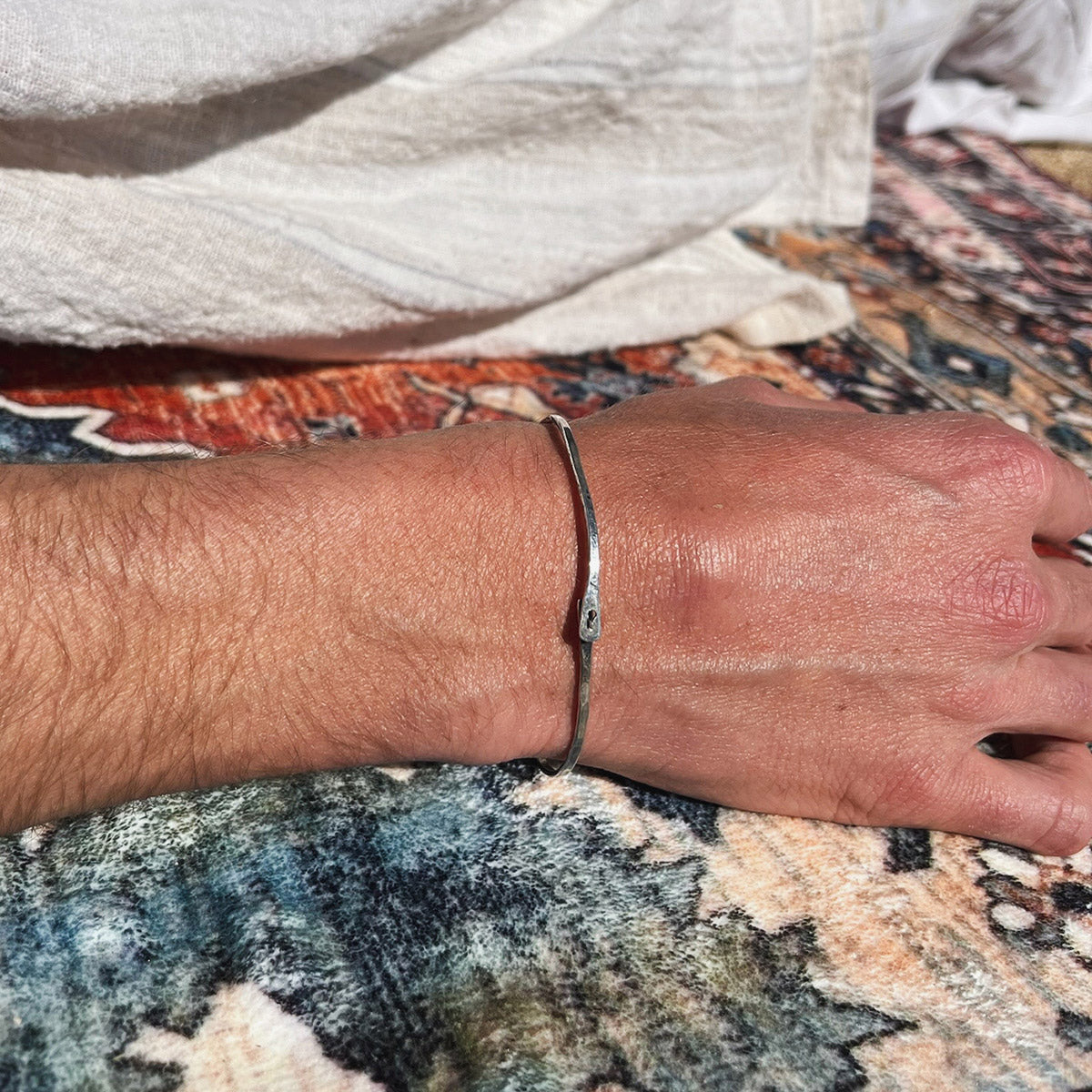 The Pera Cuff. Our minimalist 925 sterling silver wire lock cuff. Hammered for texture with an oxidized finish. Handmade, hand-shaped, and hand-polished. No two exactly the same.