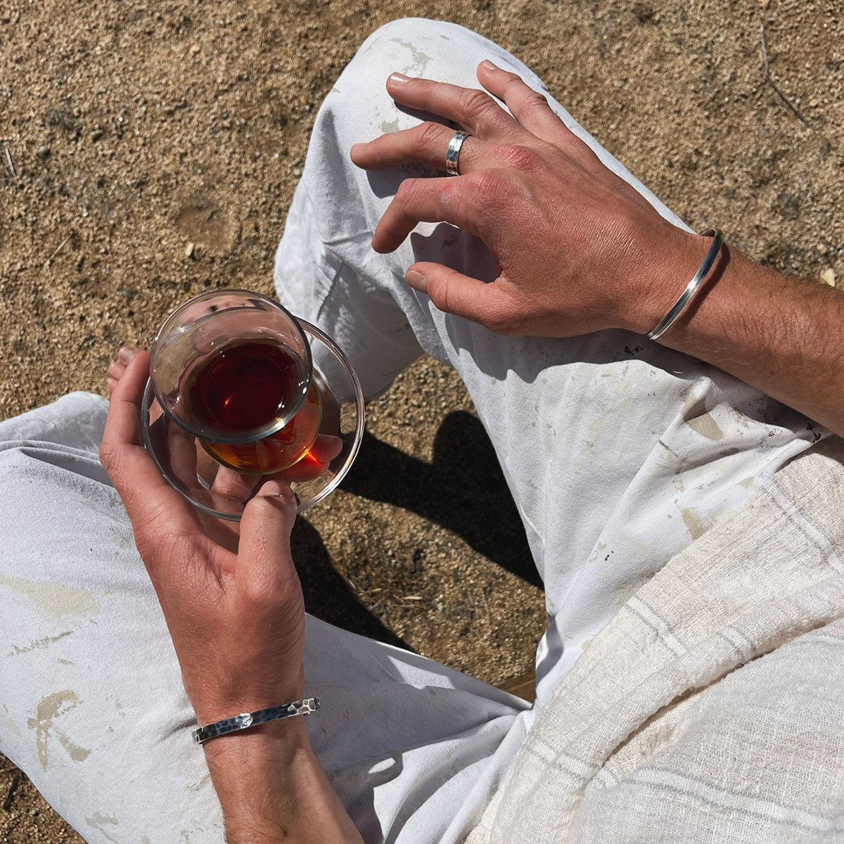 The Topanga Cuff. Our medium sized weighted style. Handcrafted from 925 sterling silver and hammered for texture with an oxidized finish. Handmade, hand-shaped, and hand-polished. No two exactly the same.